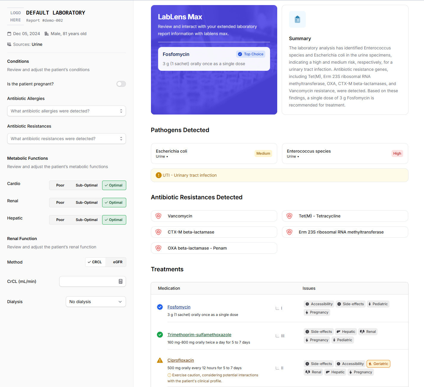 LabLens MAX: An interactive clinical decision support tool, LabLens MAX allows providers to personalize treatment protocols by adjusting patient conditions. Accessed via a secure provider portal or a QR code embedded in the patient report, it delivers real-time updates and prescriptive antimicrobial guidance tailored to each patient.